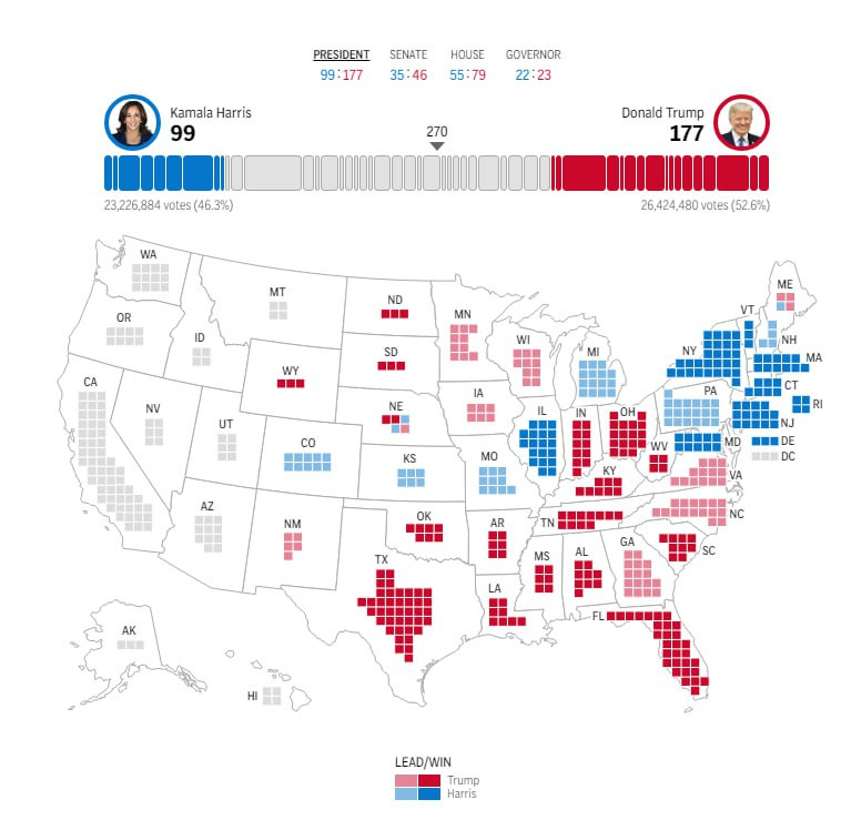 На данный момент, из 7 колеблющихся штатов - 3 пока за Трампом (Джорджия, Серверная Каролина и Висконсин) и 2 за Харрис (Мичиган и Пенсильвания). Американский сайт Decision Desk HQ, специализирующийся на освещении выборов, даёт Трампу 70% вероятности победы.